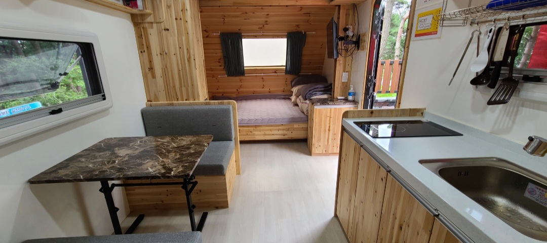 침구도 뽀송하고 카라반내부에 나무냄새가 나서 너무 좋아요
